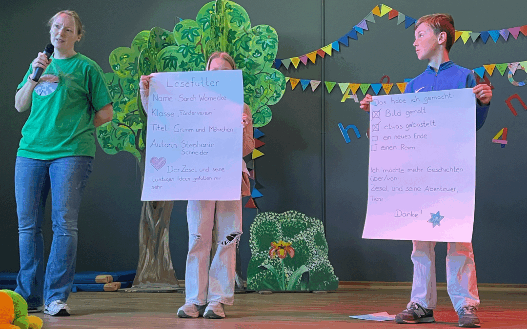 Frau Warnecke hat das Projekt kürzlich in der Aula während des Frühlingsforums vorgestellt und dabei gleich den Tausend-Büchler-Wurm höchstpersönlich mitgebracht. Die Begeisterung war groß: Der bunte Wurm steht symbolisch für das Ziel des Projekts – gemeinsam möglichst viele Bücher zu lesen.